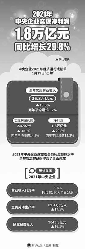 數(shù)據(jù)顯示,2021年,中央企業(yè)實(shí)現(xiàn)營業(yè)收入36.3萬億元,同比增長19.5%;實(shí)現(xiàn)利潤總額2.4萬億元,同比增長30.3%;實(shí)現(xiàn)凈利潤1.8萬億元,同比增長29.8%,均創(chuàng)歷史最好水平。中央企業(yè)全員勞動(dòng)生產(chǎn)率人均達(dá)到69.4萬元,同比增長17.5%;百元營業(yè)收入支付的成本費(fèi)用為94元,同比下降0.9元;年末資產(chǎn)負(fù)債率為64.9%,圓滿完成控制在65%以下的目標(biāo)。