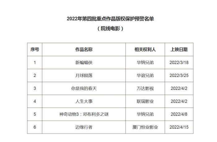 2022第四批重點(diǎn)作品版權(quán)保護(hù)預(yù)警名單(院線電影)公布
