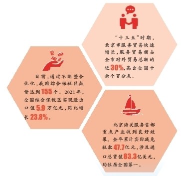 兩年多來,北京“兩區(qū)”建設成效突出、亮點紛呈。作為創(chuàng)新示范者,北京海關助力天竺綜保區(qū)加快打造具有服務貿(mào)易特色的綜合保稅區(qū),為北京開放發(fā)展先行先試前沿政策,為我國海關特殊監(jiān)管區(qū)域創(chuàng)新發(fā)展探索經(jīng)驗。2021年度,天竺綜保區(qū)進出口值、營業(yè)收入、屬地稅收分別同比增長37.6%、25.1%、22.1%,其中藥品藥械、文化藝術品進口規(guī)模分別占到全國總量的1/5、1/3。目前,園區(qū)形成了醫(yī)療健康、文化貿(mào)易、升級型消費、航空服務等重點產(chǎn)業(yè)。