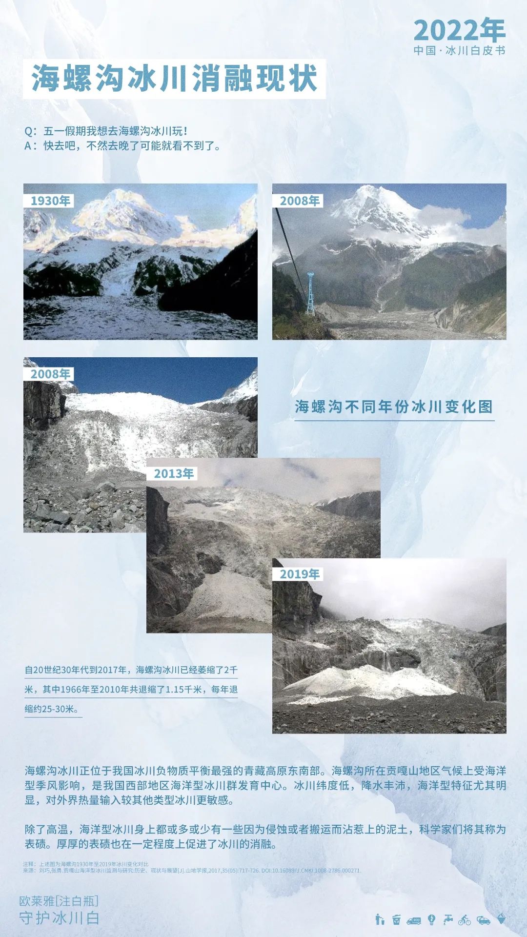 青藏高原海螺溝冰川消融現(xiàn)狀。來自騰訊新聞&中華環(huán)境保護基金會&巴黎歐萊雅:《“守護冰川白”:2022中國冰川白皮書》