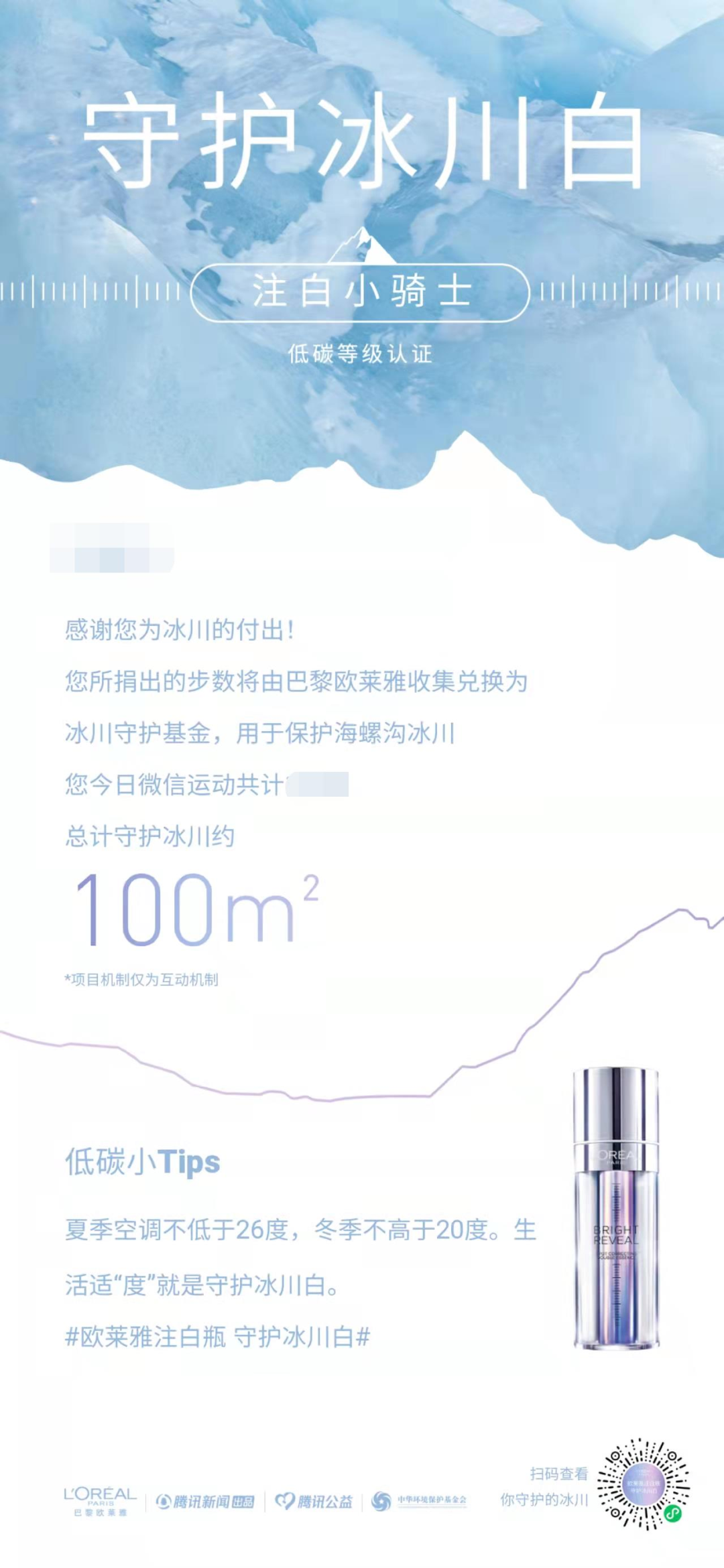 為了能更好地體現(xiàn)“守護肌膚凈白”的理念,巴黎歐萊雅和新聞機構還共同發(fā)起了“守護冰川白”公益事件,據悉,注白瓶保護冰川的初衷是“守護肌膚凈白,也守護地球最后一片凈白”。該活動旨在通過呼吁低碳生活方式,促進減排并由此為保護冰川貢獻力量。