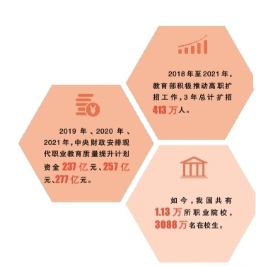 服務(wù)地方發(fā)展,還有實打?qū)嵉臄?shù)字支撐。2019年高職擴(kuò)招116.5萬人、2020年高職擴(kuò)招157.4萬人、2021年高職擴(kuò)招139.4萬人,他們中有退役軍人、下崗失業(yè)人員、農(nóng)民工。高職擴(kuò)招為社會培養(yǎng)高素質(zhì)技術(shù)技能人才的同時,也有效緩解了嚴(yán)峻的就業(yè)形勢。