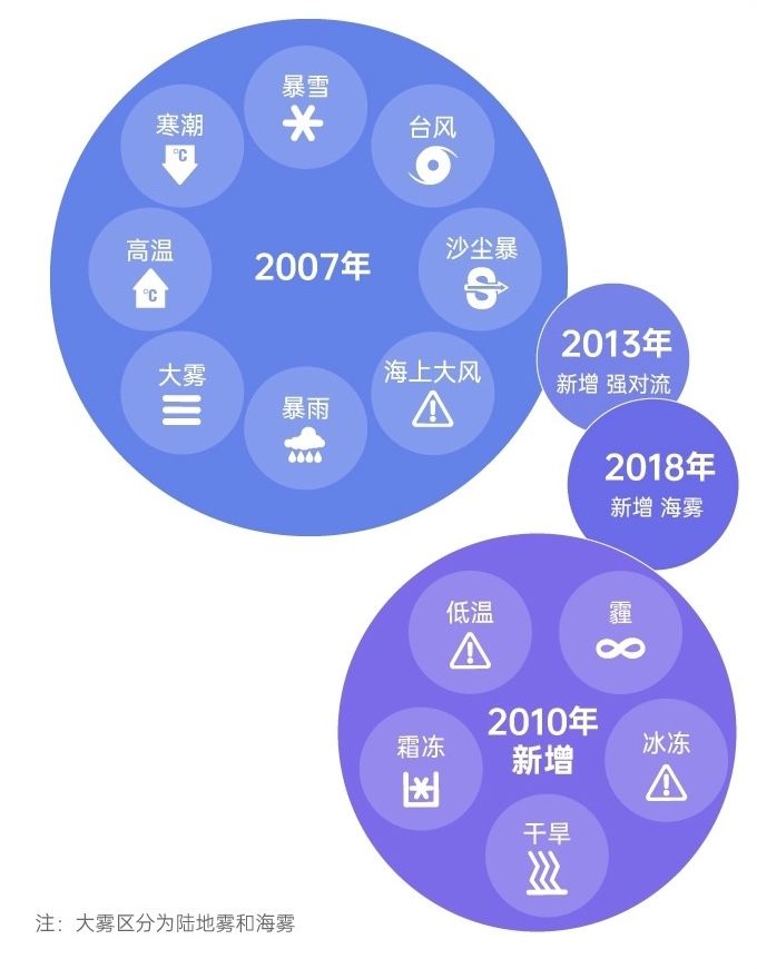 2007年,中國氣象局制定并發(fā)布《中央氣象臺氣象災(zāi)害警報(bào)發(fā)布辦法(試行)》,適用于8類氣象災(zāi)害預(yù)警;2010年,氣象災(zāi)害預(yù)警增至13類;2013年新增強(qiáng)對流預(yù)警發(fā)布辦法,至此氣象災(zāi)害預(yù)警增至14類。2018年,在大霧氣象災(zāi)害預(yù)警中還新增了海霧預(yù)警發(fā)布辦法。