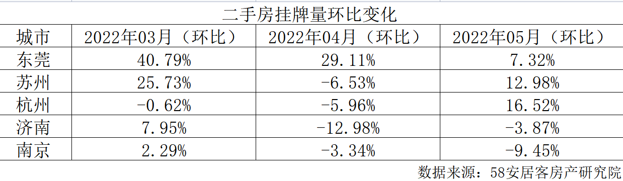 不過,安居客數(shù)據(jù)顯示,5月,東莞市掛牌房源的增長(zhǎng)幅度明顯低于3、4月,截至5月24日,5月份,東莞二手房掛牌量環(huán)比增長(zhǎng)7.32%,而此前的3月和4月,東莞市二手房掛牌量分別環(huán)比增長(zhǎng)40.79%和29.11%。