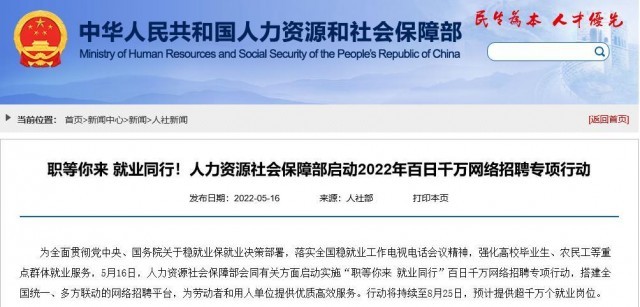 近日,人力資源和社會保障部會同有關(guān)方面啟動實(shí)施“職等你來 就業(yè)同行”百日千萬網(wǎng)絡(luò)招聘專項行動,搭建全國統(tǒng)一、多方聯(lián)動的網(wǎng)絡(luò)招聘平臺。行動將持續(xù)至8月25日,預(yù)計提供超千萬個就業(yè)崗位。此次專項行動主會場設(shè)在:中國公共招聘網(wǎng)、中國國家人才網(wǎng)、“就業(yè)在線”,并開設(shè)就業(yè)導(dǎo)引地圖,鏈接各省招聘分會場和相關(guān)社會參與方。