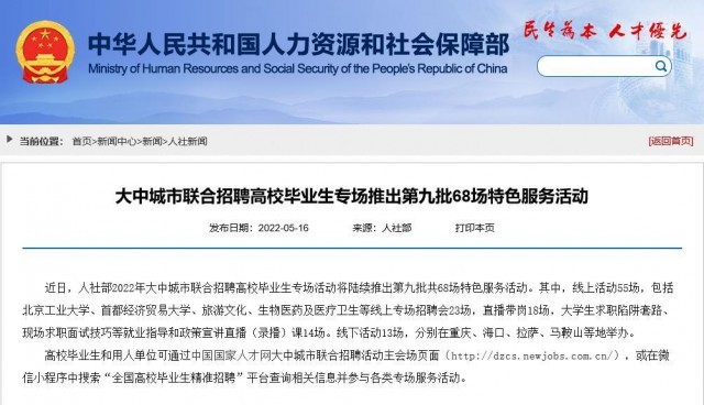近日,人社部2022年大中城市聯(lián)合招聘高校畢業(yè)生專場活動陸續(xù)推出第九批共68場特色服務(wù)活動。其中,線上活動55場,包括北京工業(yè)大學(xué)、首都經(jīng)濟(jì)貿(mào)易大學(xué)、旅游文化、生物醫(yī)藥及醫(yī)療衛(wèi)生等線上專場招聘會23場,直播帶崗18場,大學(xué)生求職陷阱套路、現(xiàn)場求職面試技巧等就業(yè)指導(dǎo)和政策宣講直播(錄播)課14場。線下活動13場,分別在重慶、???、拉薩、馬鞍山等地舉辦。