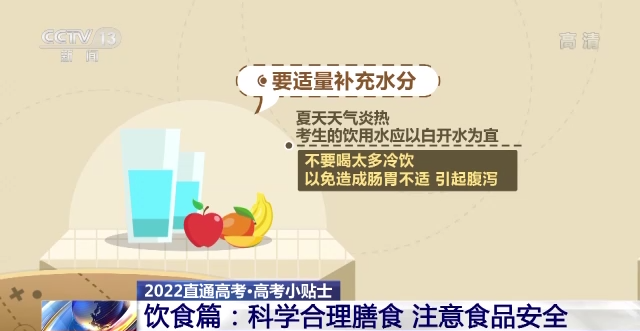同時(shí),要適量補(bǔ)充水分。夏天天氣炎熱,考生的飲用水應(yīng)以白開(kāi)水為宜,不要喝太多冷飲,以免造成腸胃不適,引起腹瀉。如遇高溫天氣,建議考生適當(dāng)補(bǔ)充淡鹽水,多吃新鮮蔬果,清淡飲食。