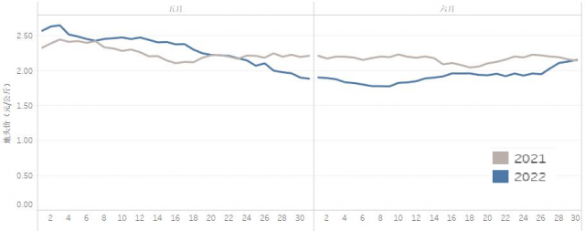 從價格走勢看(圖1),呈現(xiàn)三個特點:一是整體處于低價區(qū)間。6月是我國露地蔬菜生產(chǎn)旺季,全國平均氣溫、平均降水量較常年同期偏高,平均日照時數(shù)較2021年偏多,整體有利于蔬菜生產(chǎn),供應(yīng)較為充足,月均地頭價環(huán)比、同比均呈下降態(tài)勢。二是月內(nèi)上旬呈下降趨勢。6月9日蔬菜地頭價1.78元/公斤,較月初1.90元/公斤下降了6.3%,跌至2022年以來的最低點,比年內(nèi)最高價(4.21元/公斤)下降57.7%。三是中下旬價格止跌回升。經(jīng)歷6月10—16日和26—30日兩輪較大幅度上漲,月末價格達到2.16元/公斤,比6月9日價格上升了21.3%。上漲主要原因:一方面,黃淮海及環(huán)渤海等地區(qū)因持續(xù)高溫天氣,設(shè)施蔬菜提前拉秧,供應(yīng)量減少。另一方面,南方持續(xù)降雨影響蔬菜正常生長和采收,江西、湖南、廣西、福建等省部分地區(qū)發(fā)生不同程度洪澇災(zāi)害,100多萬畝蔬菜受災(zāi)。此外,受疫情影響的社會性消費開始復蘇,蔬菜需求量增加。
