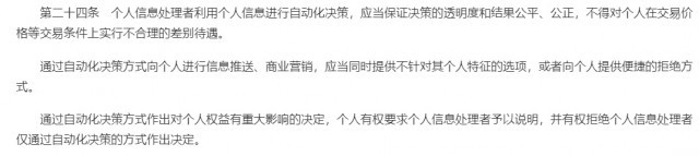 《中華人民共和國個人信息保護法》第24條明確規(guī)定了用戶對自動化決策的拒絕權(quán),即“通過自動化決策方式向個人進行信息推送、商業(yè)營銷,應當同時提供不針對其個人特征的選項,或者向個人提供便捷的拒絕方式”。