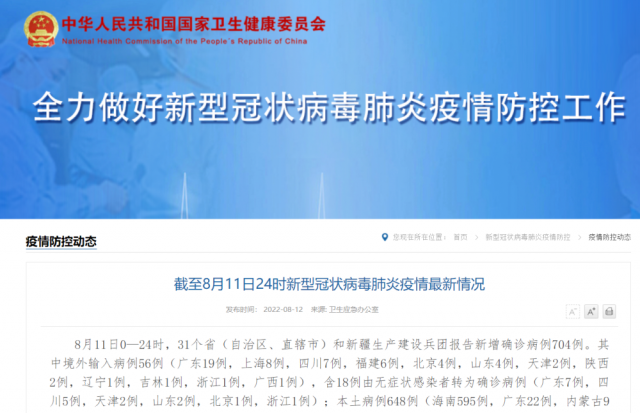 8月11日0—24時,31個省(自治區(qū)、直轄市)和新疆生產(chǎn)建設(shè)兵團報告新增確診病例704例。其中境外輸入病例56例(廣東19例,上海8例,四川7例,福建6例,北京4例,山東4例,天津2例,陜西2例,遼寧1例,吉林1例,浙江1例,廣西1例),含18例由無癥狀感染者轉(zhuǎn)為確診病例(廣東7例,四川5例,天津2例,山東2例,北京1例,浙江1例);本土病例648例(海南595例,廣東22例,內(nèi)蒙古9例,西藏7例,福建5例,上海2例,河南1例,重慶1例,四川1例,貴州1例,云南1例,陜西1例,甘肅1例,新疆1例),含11例由無癥狀感染者轉(zhuǎn)為確診病例(廣東7例,海南1例,四川1例,貴州1例,新疆1例)。無新增死亡病例。無新增疑似病例。