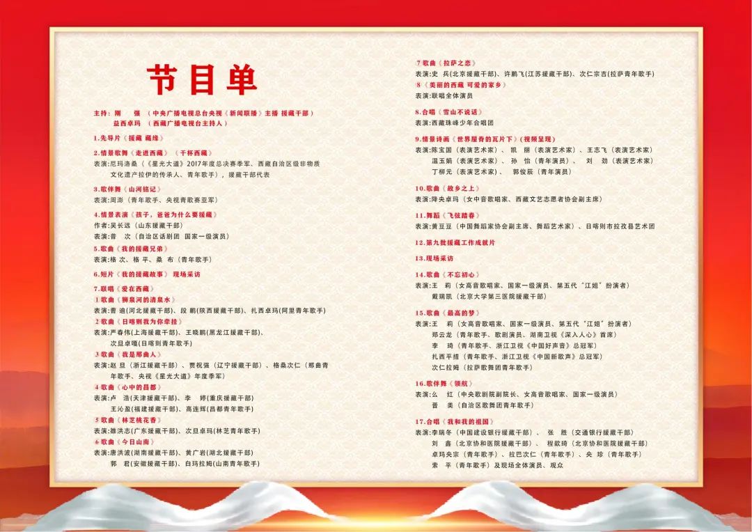 為展現(xiàn)援藏工作成就,弘揚援藏精神,表達西藏各族干部群眾對習近平總書記和黨中央的親切關懷、全國人民無私支援特別是對援藏干部人才的敬意和感恩之情,由自治區(qū)黨委宣傳部、自治區(qū)黨委組織部共同主辦的援藏主題晚會《哈達獻給您》將于8月18日晚,在西藏衛(wèi)視(《西藏新聞聯(lián)播》后)、西藏藏語衛(wèi)視(19:30左右)播出,自治區(qū)七地市廣播電視臺將同步播出(地市《新聞聯(lián)播》后)。