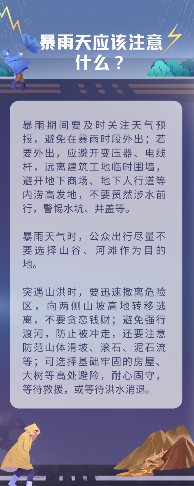 暴雨天應該注意什么?業(yè)內(nèi)專家建議,暴雨期間要及時關(guān)注天氣預報,避免在暴雨時段外出;若要外出,應避開變壓器、電線桿,遠離建筑工地臨時圍墻,避開地下商場、地下人行道等內(nèi)澇高發(fā)地,不要貿(mào)然涉水前行,警惕水坑、井蓋等。