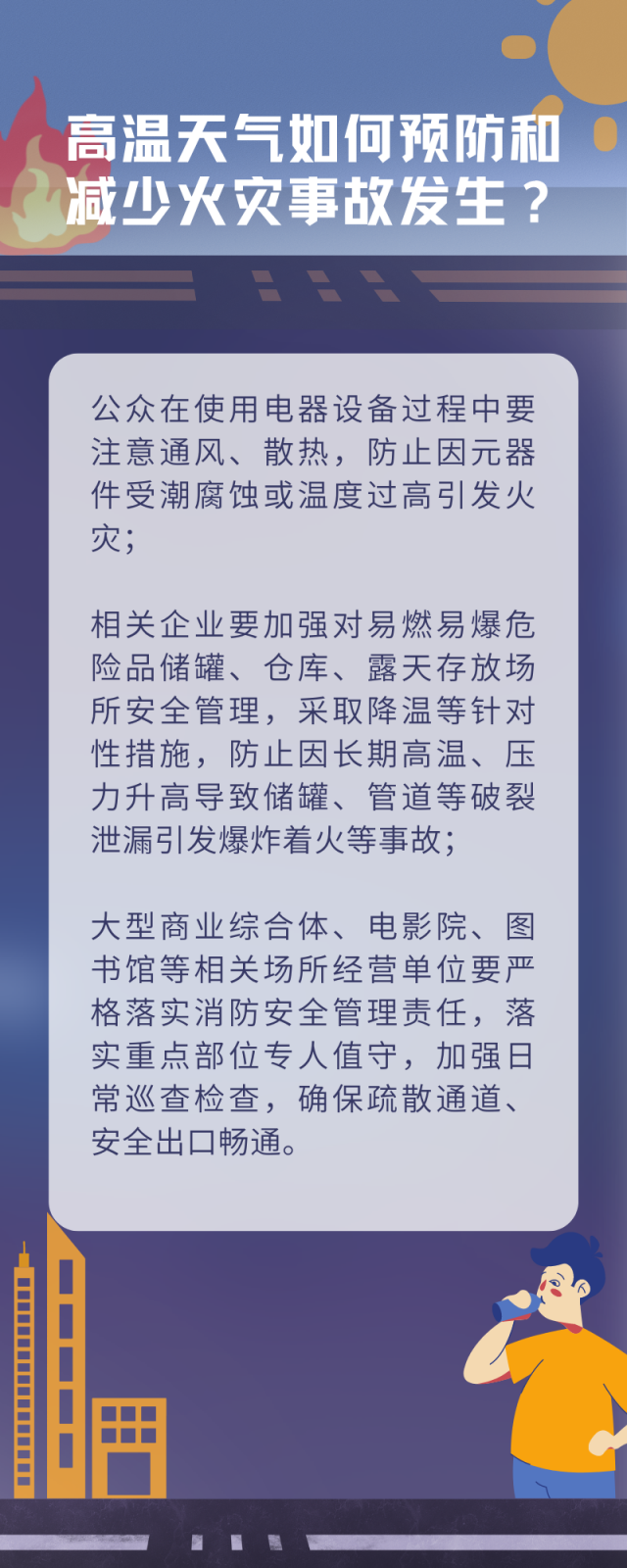 高溫天氣如何有效預防和減少火災事故發(fā)生?應急管理部消防救援局發(fā)布消防安全提示,公眾在使用電器設備過程中要注意通風、散熱,防止因元器件受潮腐蝕或溫度過高引發(fā)火災;相關(guān)企業(yè)要加強對易燃易爆危險品儲罐、倉庫、露天存放場所安全管理,采取降溫等針對性措施,防止因長期高溫、壓力升高導致儲罐、管道等破裂泄漏引發(fā)爆炸著火等事故;大型商業(yè)綜合體、電影院、圖書館等相關(guān)場所經(jīng)營單位要嚴格落實消防安全管理責任,落實重點部位專人值守,加強日常巡查檢查,確保疏散通道、安全出口暢通。