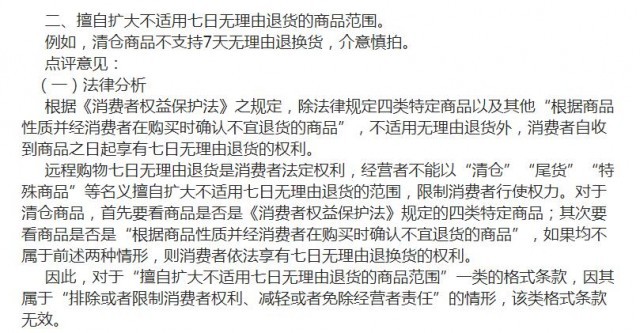 因此,對于“擅自擴大不適用七日無理由退貨的商品范圍”一類的格式條款,因其屬于“排除或者限制消費者權(quán)利、減輕或者免除經(jīng)營者責(zé)任”的情形,該類格式條款無效。(中新財經(jīng))