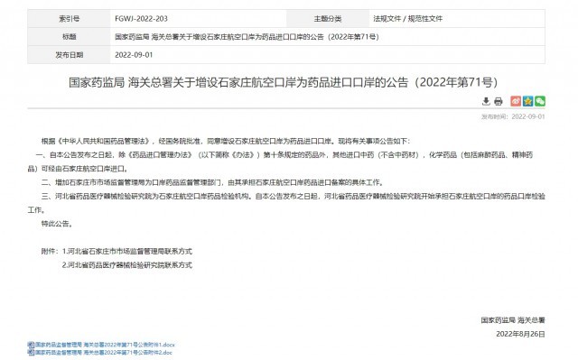 央視網(wǎng)消息:據(jù)國家藥監(jiān)局網(wǎng)站9月1日消息,國家藥監(jiān)局、海關總署發(fā)布關于增設石家莊航空口岸為藥品進口口岸的公告。