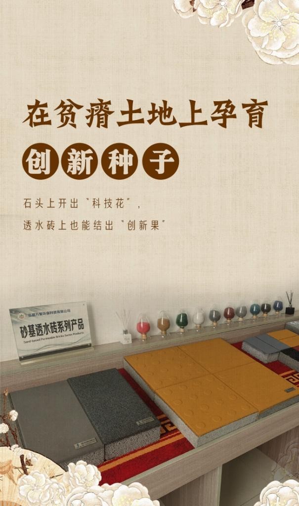 這家環(huán)保科技公司也是武鄉(xiāng)縣近幾年培育的本土創(chuàng)新型企業(yè)。公司負責人郝晉庭介紹說,紅磚“吃”土地,又不環(huán)保。2014年,公司轉向新型透水磚行業(yè),研發(fā)出的新產品透水效果一流,耐堵耐凍,獲得多項國家發(fā)明專利。