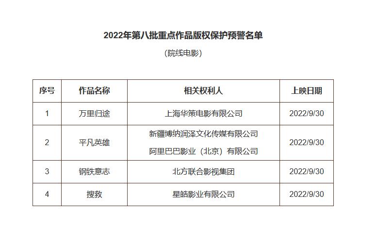 中新網9月30日電 據國家版權局29日消息,2022年度第八批重點作品版權保護預警名單公布,包含院線電影《萬里歸途》《平凡英雄》《鋼鐵意志》《搜救》。