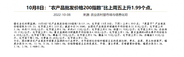央視網(wǎng)消息:據(jù)農(nóng)業(yè)農(nóng)村部網(wǎng)站,10月8日"農(nóng)產(chǎn)品批發(fā)價格200指數(shù)"為127.54,比節(jié)前(9月30日,下同)上升1.99個點,“菜籃子”產(chǎn)品批發(fā)價格指數(shù)為129.35,比節(jié)前上升2.32個點。截至今日14:00時,全國農(nóng)產(chǎn)品批發(fā)市場豬肉平均價格為32.81元/公斤,比節(jié)前上升2.5%。