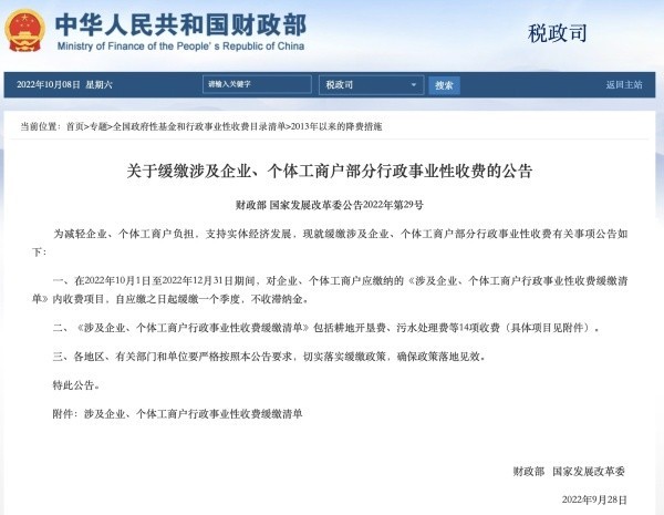 央視網(wǎng)消息:財(cái)政部網(wǎng)站8日發(fā)布關(guān)于緩繳涉及企業(yè)、個(gè)體工商戶部分行政事業(yè)性收費(fèi)的公告。