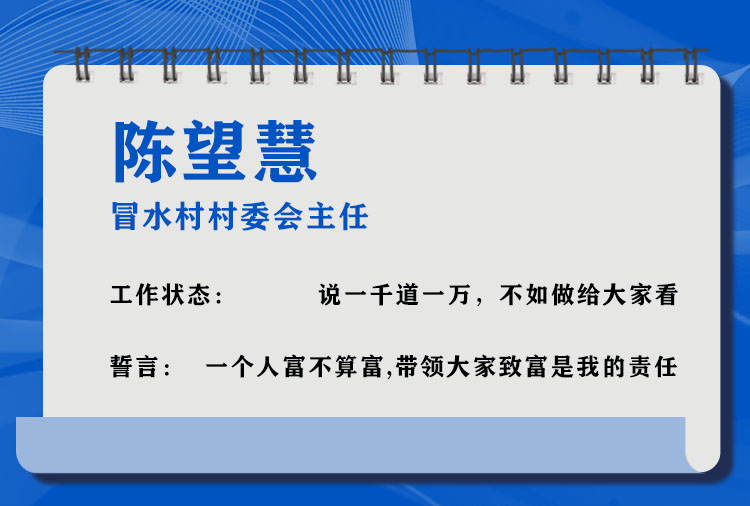 2011年,陳望慧加入了中國共產(chǎn)黨。這一年,冒水村換屆選舉,陳望慧作為村上的致富能人,在村黨支部多次動員和群眾的勸說下,放下經(jīng)營多年、收入可觀的飯店回村,當(dāng)選為冒水村村委會主任。