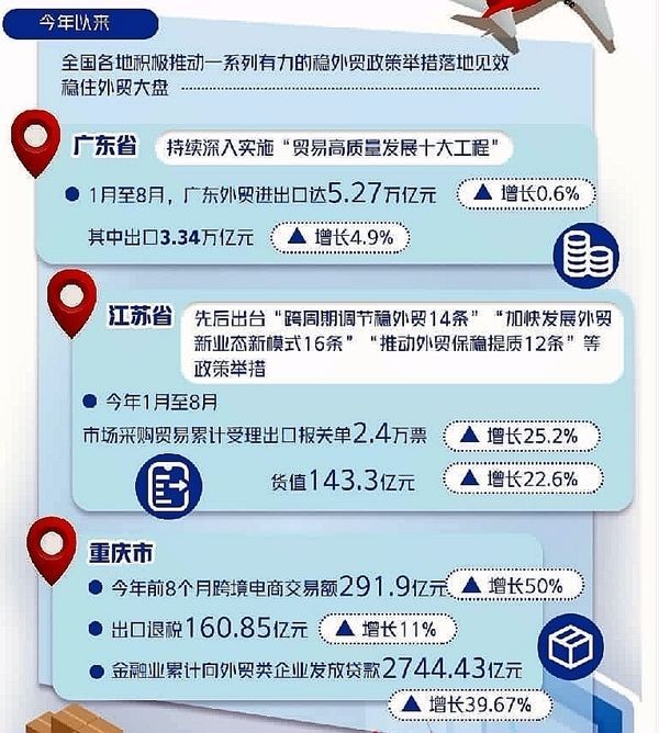 跨境電商等新業(yè)態(tài)也成為穩(wěn)外貿(mào)的重要力量。今年,重慶成功舉辦了跨境電商交易會,積極推動跨境電商“保稅進口+零售分裝”業(yè)務(wù)試點,推廣“跨境電商+產(chǎn)業(yè)帶”模式,為外貿(mào)企業(yè)穩(wěn)訂單、拓市場提供了新的解決方案。今年前8個月,重慶跨境電商交易額達291.9億元,增長50%。
