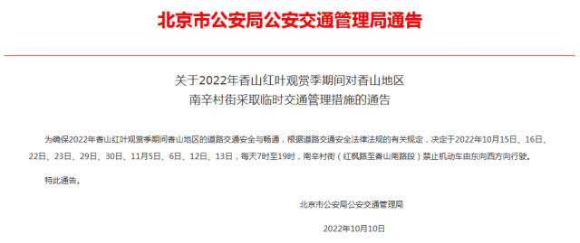 北京市交管局網(wǎng)站發(fā)布通告,為確保今年香山紅葉觀賞季期間的道路交通安全與暢通,10月15日、16日、22日、23日、29日、30日、11月5日、6日、12日、13日,每天7時(shí)至19時(shí),南辛村街(紅楓路至香山南路段)禁止機(jī)動(dòng)車由東向西方向行駛。
