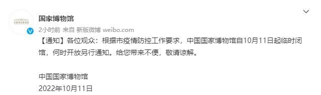 國(guó)家博物館10月10日發(fā)布通知稱,根據(jù)市疫情防控工作要求,中國(guó)國(guó)家博物館自10月11日起臨時(shí)閉館,何時(shí)開放另行通知。給您帶來不便,敬請(qǐng)諒解。