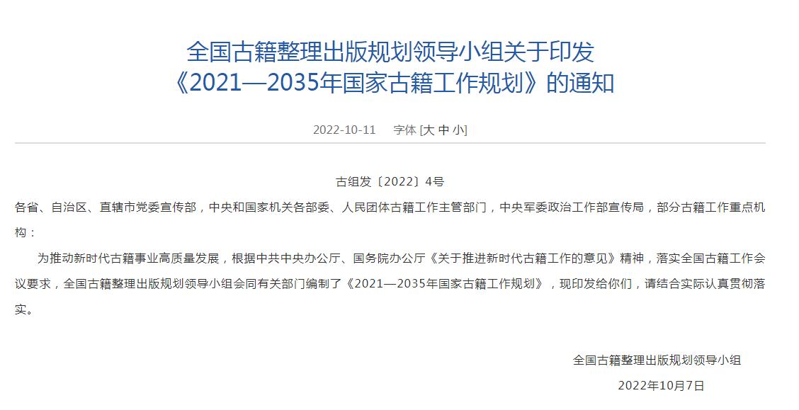 根據(jù)規(guī)劃,到2035年,古籍工作體制機(jī)制更加完善,標(biāo)準(zhǔn)規(guī)范體系基本健全,古籍保護(hù)、 整理研究和編輯出版成果豐碩,質(zhì)量明顯提升,古籍?dāng)?shù)字化資源建設(shè)取得重要進(jìn)展, 古籍普及深入推進(jìn),人才隊(duì)伍發(fā)展壯大,古籍工作在傳承和弘揚(yáng)中華優(yōu)秀傳統(tǒng)文化中的作用更加突出。