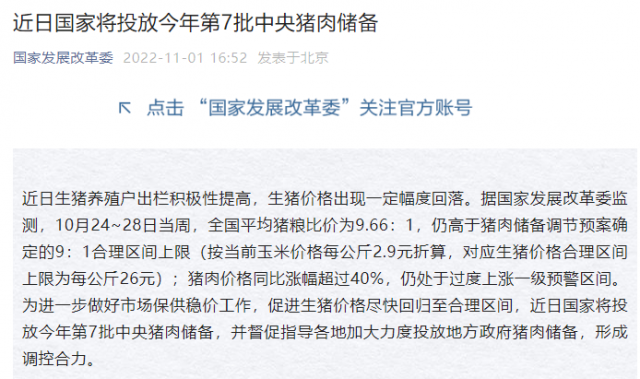 據(jù)國家發(fā)改委消息,為進一步做好市場保供穩(wěn)價工作,促進生豬價格盡快回歸至合理區(qū)間,近日國家將投放今年第7批中央豬肉儲備,并督促指導各地加大力度投放地方政府豬肉儲備,形成調(diào)控合力。