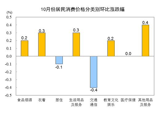 10月份,全國居民消費價格環(huán)比上漲0.1%。其中,城市持平,農村上漲0.1%;食品價格上漲0.1%,非食品價格持平;消費品價格上漲0.1%,服務價格持平。