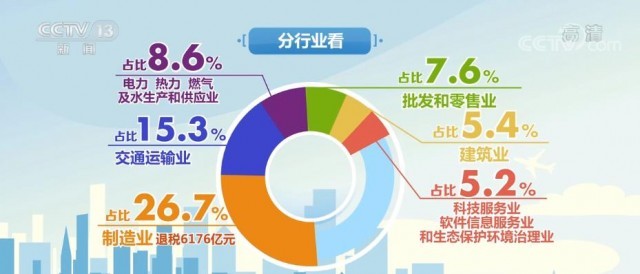 數(shù)據(jù)顯示,分行業(yè)看,制造業(yè)是受益最明顯的行業(yè),退稅6176億元,占比26.7%;交通運輸業(yè)占15.3%;電力、熱力、燃?xì)饧八a(chǎn)和供應(yīng)業(yè)、批發(fā)和零售業(yè)、建筑業(yè)、科技服務(wù)業(yè)、軟件信息服務(wù)業(yè)和生態(tài)保護環(huán)境治理業(yè)占比從8.6%到5.2%不等。