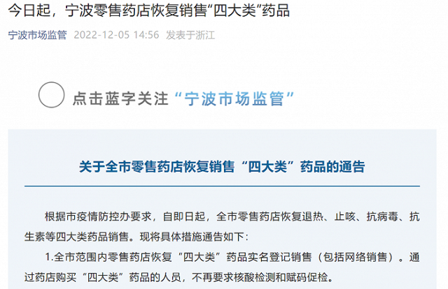 寧波市市場監(jiān)督管理局12月5日在其官方微信公眾號上發(fā)布通告,根據(jù)市疫情防控辦要求,自即日起,全市零售藥店恢復(fù)退熱、止咳、抗病毒、抗生素等四大類藥品銷售。現(xiàn)將具體措施通告如下: