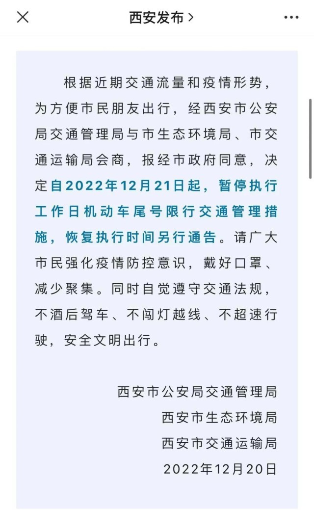 12月20日,陜西西安多部門發(fā)布通知,根據(jù)近期交通流量和疫情形勢(shì),為方便市民朋友出行,決定自2022年12月21日起,暫停執(zhí)行工作日機(jī)動(dòng)車尾號(hào)限行交通管理措施,恢復(fù)執(zhí)行時(shí)間另行通告。