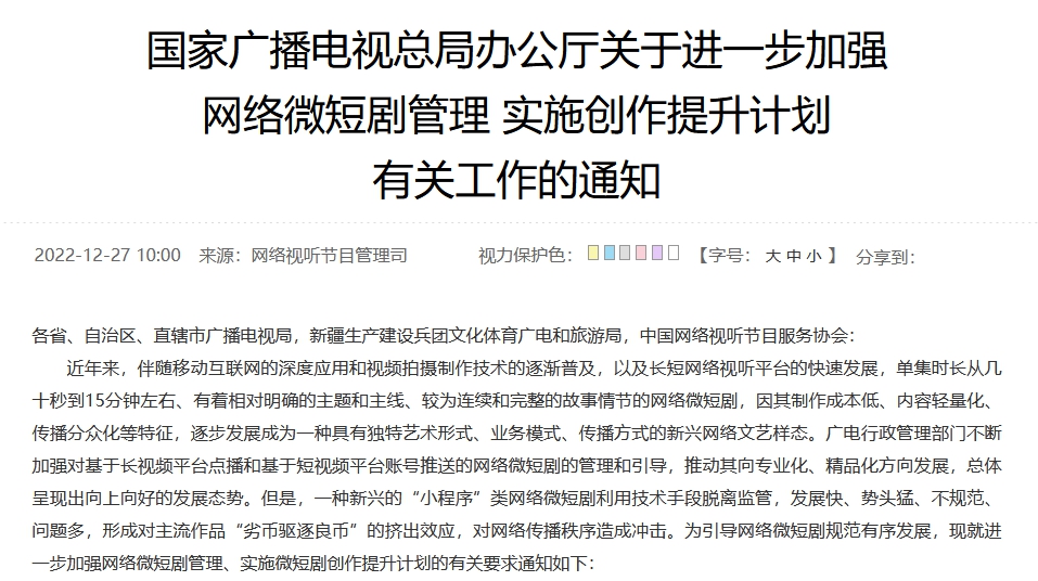 然而一種新興的“小程序”類(lèi)網(wǎng)絡(luò)微短劇利用技術(shù)手段脫離監(jiān)管,發(fā)展快、勢(shì)頭猛、不規(guī)范、問(wèn)題多,形成對(duì)主流作品“劣幣驅(qū)逐良幣”的擠出效應(yīng),對(duì)網(wǎng)絡(luò)傳播秩序造成沖擊。為引導(dǎo)網(wǎng)絡(luò)微短劇規(guī)范有序發(fā)展,廣電總局此次就進(jìn)一步加強(qiáng)網(wǎng)絡(luò)微短劇管理、實(shí)施微短劇創(chuàng)作提升計(jì)劃發(fā)布一系列具體措施。