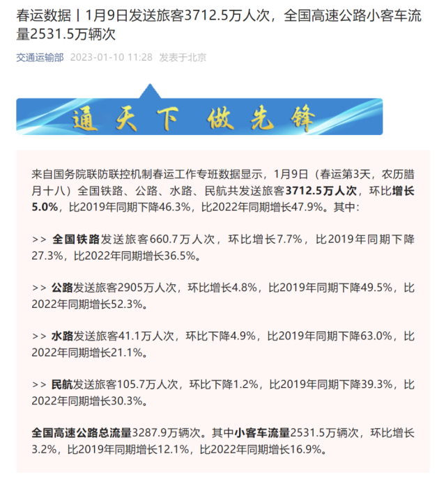 來自國務(wù)院聯(lián)防聯(lián)控機制春運工作專班數(shù)據(jù)顯示,1月9日(春運第3天,農(nóng)歷臘月十八)全國鐵路、公路、水路、民航共發(fā)送旅客3712.5萬人次,環(huán)比增長5.0%,比2019年同期下降46.3%,比2022年同期增長47.9%。其中: