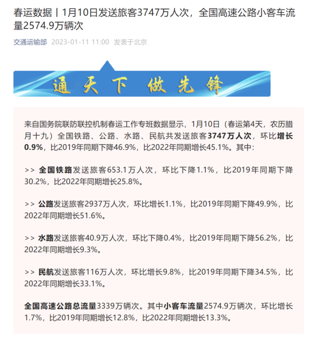 來(lái)自國(guó)務(wù)院聯(lián)防聯(lián)控機(jī)制春運(yùn)工作專(zhuān)班數(shù)據(jù)顯示,1月10日(春運(yùn)第4天,農(nóng)歷臘月十九)全國(guó)鐵路、公路、水路、民航共發(fā)送旅客3747萬(wàn)人次,環(huán)比增長(zhǎng)0.9%,比2019年同期下降46.9%,比2022年同期增長(zhǎng)45.1%。其中: