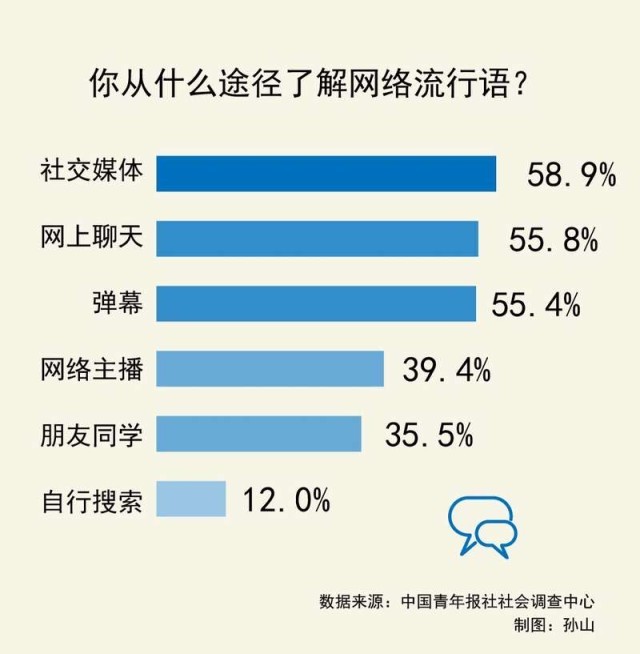 數(shù)據(jù)顯示,微博、小紅書(shū)、微信等社交媒體(58.9%)是受訪青年知曉網(wǎng)絡(luò)流行語(yǔ)的主要途徑。接下來(lái)是網(wǎng)上聊天(55.8%)、彈幕(55.4%)。其他還有:網(wǎng)絡(luò)主播(39.4%)、朋友同學(xué)(35.5%)和自行搜索(12.0%)等。
