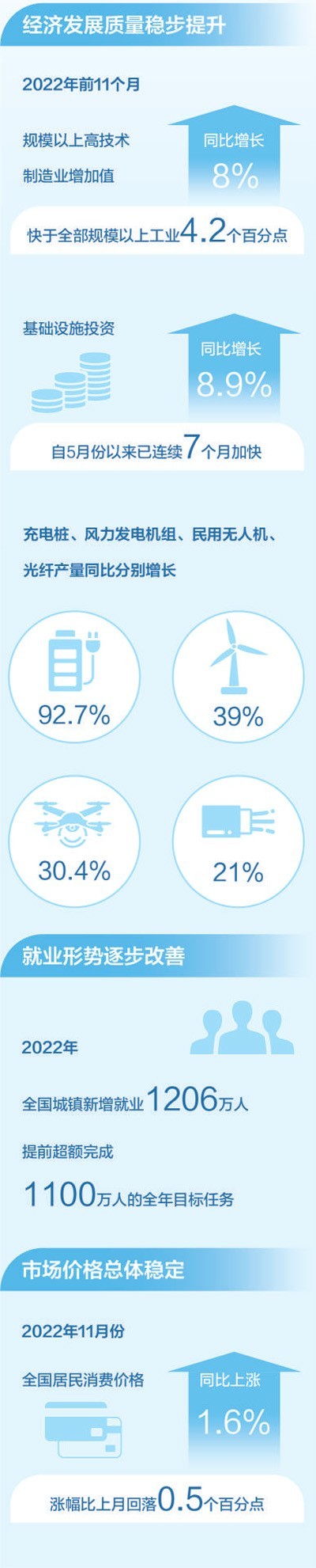 2022年,面對(duì)風(fēng)高浪急的國(guó)際環(huán)境和艱巨繁重的國(guó)內(nèi)改革發(fā)展穩(wěn)定任務(wù),我國(guó)經(jīng)濟(jì)穩(wěn)健發(fā)展,全年國(guó)內(nèi)生產(chǎn)總值預(yù)計(jì)超過(guò)120萬(wàn)億元??垂┙o結(jié)構(gòu),產(chǎn)業(yè)升級(jí)發(fā)展持續(xù),新動(dòng)能積蓄增強(qiáng)。2022年前11個(gè)月,規(guī)模以上高技術(shù)制造業(yè)增加值同比增長(zhǎng)8%,快于全部規(guī)模以上工業(yè)4.2個(gè)百分點(diǎn);看消費(fèi)需求,線(xiàn)上消費(fèi)需求釋放帶動(dòng)作用明顯。前11個(gè)月,全國(guó)實(shí)物商品網(wǎng)上零售額同比增長(zhǎng)6.4%,網(wǎng)絡(luò)購(gòu)物帶動(dòng)快遞等行業(yè)較快增長(zhǎng)。