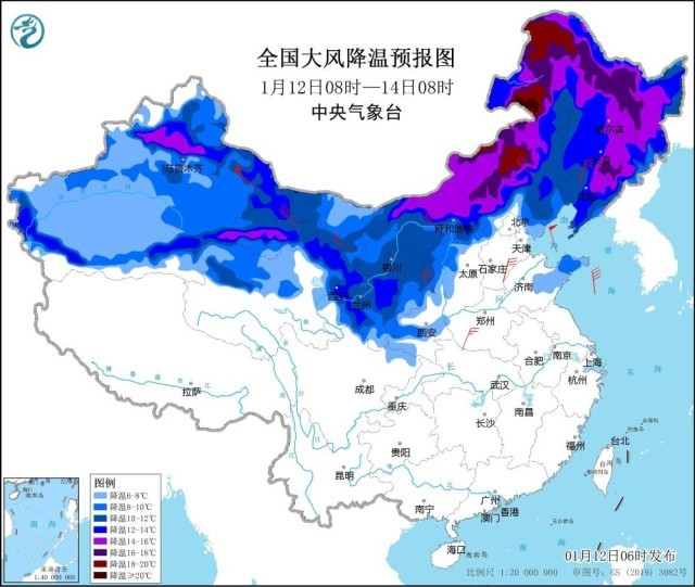 1月12日6時,中央氣象臺繼續(xù)發(fā)布寒潮藍(lán)色預(yù)警:受強冷空氣影響,預(yù)計,1月12日8時至1月16日8時,寒潮天氣將自西向東影響我國大部地區(qū),其中,12日主要影響西北地區(qū),13日至15日影響我國中東部地區(qū)。我國大部地區(qū)氣溫將先后下降8~12℃,其中,新疆沿天山以北、甘肅西部和中南部、內(nèi)蒙古中東部、東北地區(qū)、江漢東部、江淮、江南、華南北部、貴州等地降溫14~18℃,內(nèi)蒙古中東部、黑龍江東部、吉林東部、遼寧東北部等地的部分地區(qū)降溫超過20℃,并伴有4~6級、陣風(fēng)6~8級的大風(fēng),新疆山口風(fēng)力可達9~11級或以上。東部和南部海區(qū)有7~9級風(fēng),陣風(fēng)可達10~11級。降溫過后,17日早晨,最低氣溫0℃線將南壓至云南東部至貴州南部、湖南南部、福建北部、浙江東部一線。