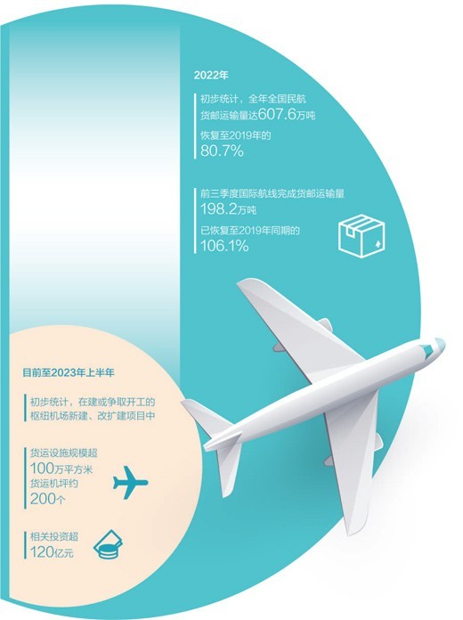 民航局有關(guān)負(fù)責(zé)人介紹,過去5年,航空貨運基礎(chǔ)設(shè)施建設(shè)取得積極進(jìn)展,新增航空貨運能力600萬噸以上。下一步,將加強航空貨運設(shè)施規(guī)劃建設(shè)指導(dǎo),初步統(tǒng)計,目前至2023年上半年在建或爭取開工的樞紐機場新建、改擴建項目中,貨運設(shè)施規(guī)模已超過100萬平方米、貨運機坪約200個,相關(guān)投資超過120億元。
