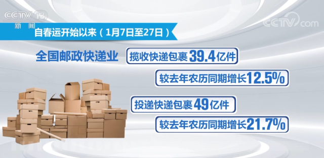數(shù)據(jù)顯示,自春運開始以來(1月7日至27日),全國郵政快遞業(yè)攬收快遞包裹39.4億件,較去年農歷同期增長12.5%;投遞快遞包裹49億件,較去年農歷同期增長21.7%。