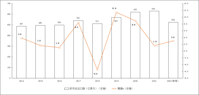軟件業(yè)務(wù)出口保持增長(zhǎng)。2022年,軟件業(yè)務(wù)出口524.1億美元,同比增長(zhǎng)3.0%,增速較上年同期回落5.8個(gè)百分點(diǎn)。其中,軟件外包服務(wù)出口同比增長(zhǎng)9.2%。