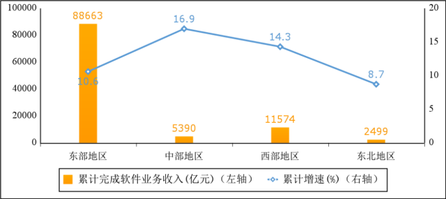 東部地區(qū)保持較快增長(zhǎng),中、西部地區(qū)增勢(shì)突出。2022年,東部、中部、西部和東北地區(qū)分別完成軟件業(yè)務(wù)收入88663億元、5390億元、11574億元和2499億元,分別同比增長(zhǎng)10.6%、16.9%、14.3%和8.7%。其中,中部、西部地區(qū)高出全國(guó)平均水平5.7、3.1個(gè)百分點(diǎn)。四個(gè)地區(qū)軟件業(yè)務(wù)收入在全國(guó)總收入中的占比分別為82.0%、5.0%、10.7%和2.3%。