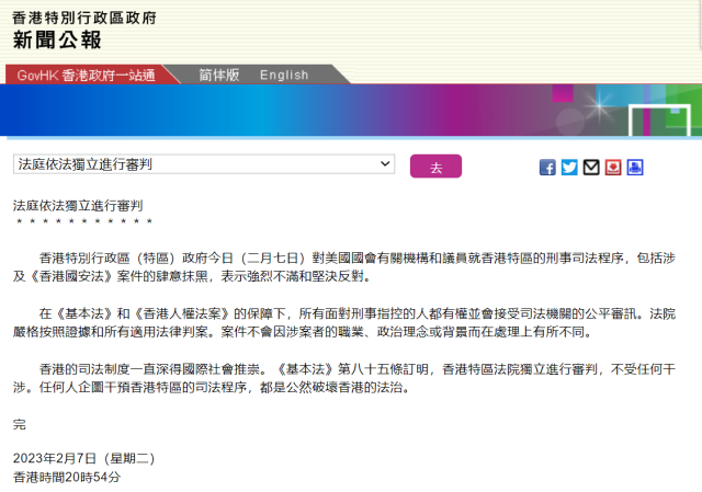 香港特區(qū)政府:堅(jiān)決反對美國會有關(guān)機(jī)構(gòu)及議員抹黑香港刑事司法程序