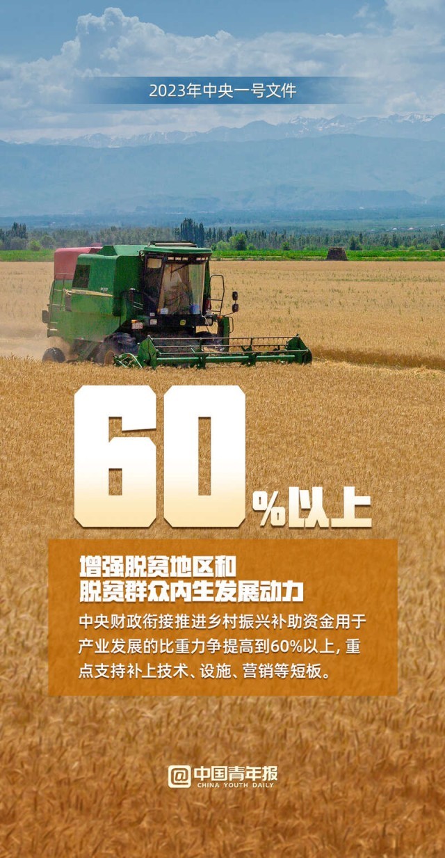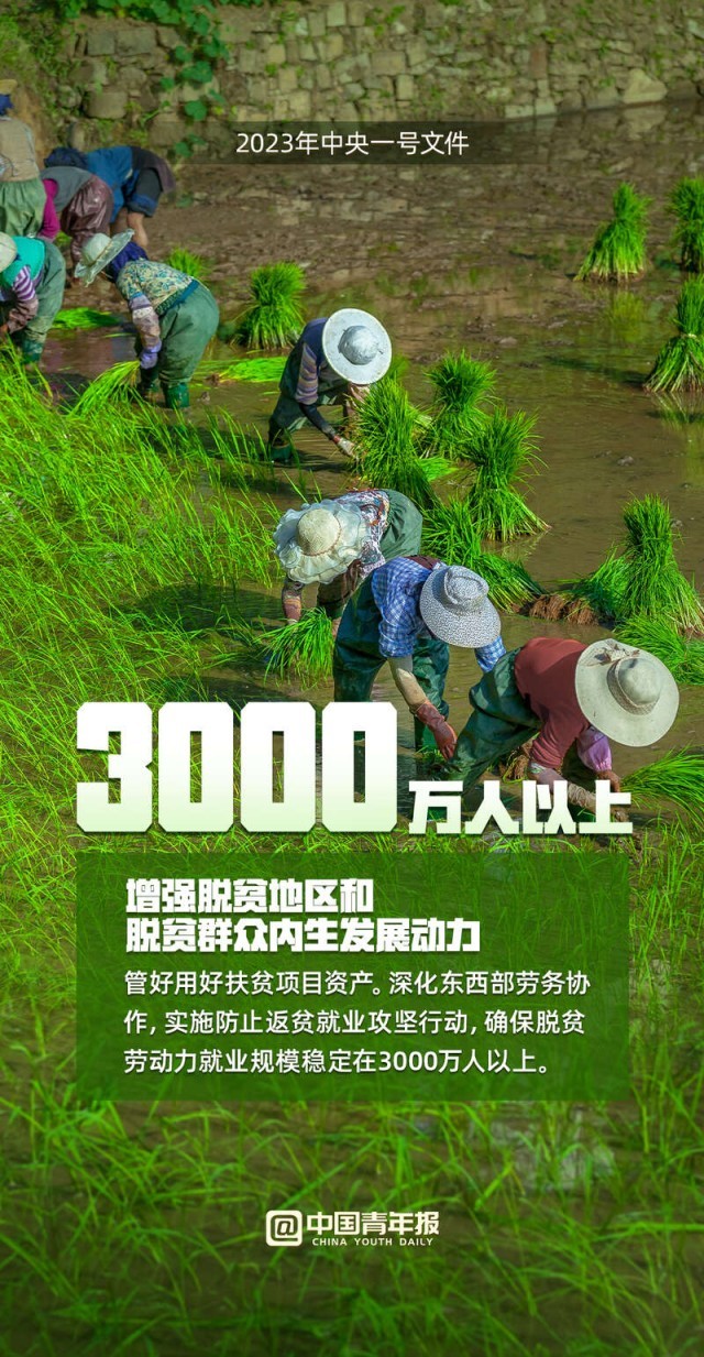 中國(guó)青年報(bào)客戶端訊(中青報(bào)·中青網(wǎng)見習(xí)記者 魏婉 制圖 程璨)“確保全國(guó)糧食產(chǎn)量保持在1.3萬億斤以上、確保脫貧勞動(dòng)力就業(yè)規(guī)模穩(wěn)定在3000萬人以上……”2月13日,2023年中央一號(hào)文件正式發(fā)布,這份文件題為《中共中央 國(guó)務(wù)院關(guān)于做好2023年全面推進(jìn)鄉(xiāng)村振興重點(diǎn)工作的意見》,全文共九個(gè)部分。文件提出,堅(jiān)決守牢確保糧食安全、防止規(guī)模性返貧等底線,扎實(shí)推進(jìn)鄉(xiāng)村發(fā)展、鄉(xiāng)村建設(shè)、鄉(xiāng)村治理等重點(diǎn)工作,加快建設(shè)農(nóng)業(yè)強(qiáng)國(guó),建設(shè)宜居宜業(yè)和美鄉(xiāng)村。