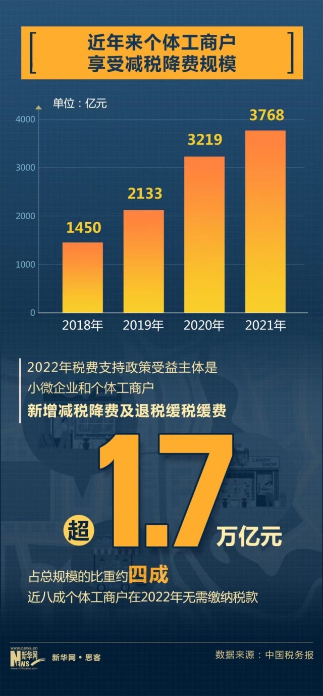 2021年,我國將包括個(gè)體工商戶在內(nèi)的小規(guī)模納稅人增值稅免稅月銷售額從10萬元提高到15萬元,對(duì)個(gè)體工商戶應(yīng)納稅所得額不超過100萬元的部分,在已有優(yōu)惠政策的基礎(chǔ)上減半征收個(gè)人所得稅。