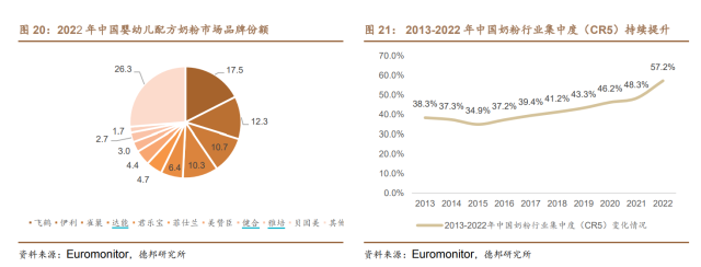 據(jù)德邦證券研報,嬰配粉市場中飛鶴、伊利、雀巢占據(jù)前三,行業(yè)集中度加速提升。根據(jù)Euromonitor的數(shù)據(jù),2022年銷售額前五的品牌為飛鶴、伊利、雀巢、達能與君樂寶,市場份額分別為17.5%、12.3%、10.7%、10.3%及6.4%,貝因美的市占率為1.7%,排名第十。前十名中,國產(chǎn)品牌和國外品牌各占5席。