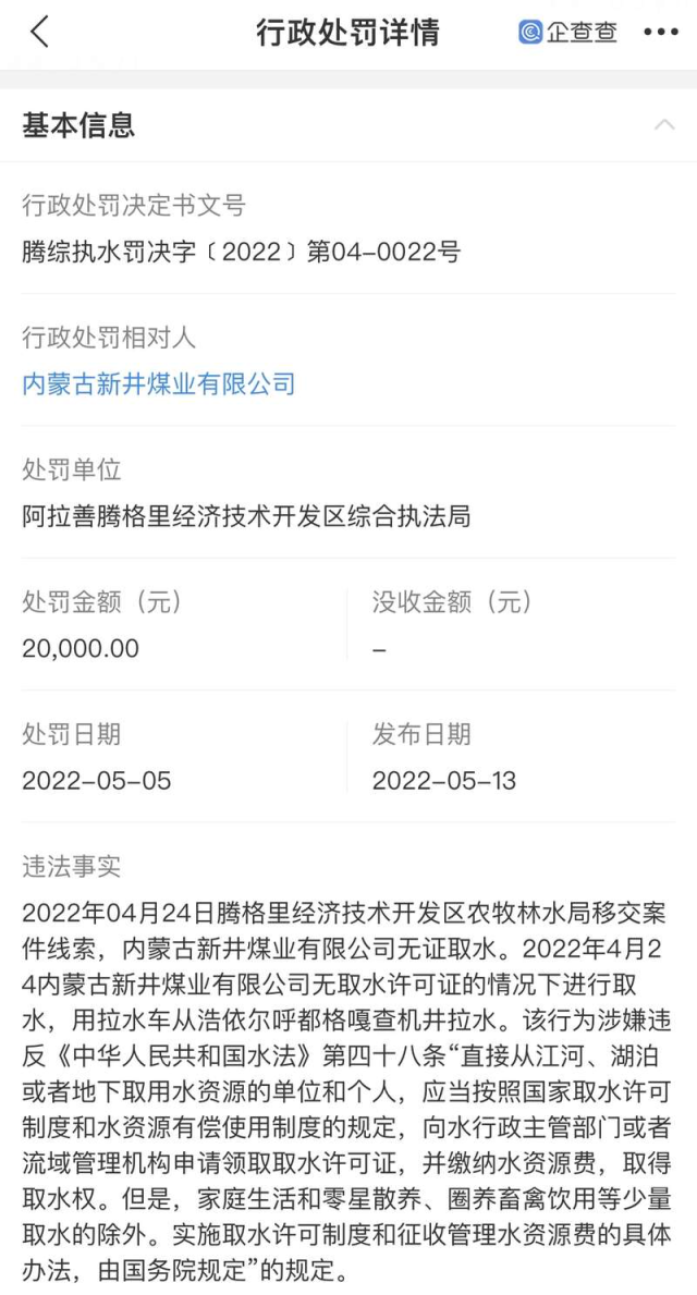 2022年該公司欠繳資源稅800多萬(wàn)元、增值稅200多萬(wàn)元,還因無(wú)取水許可證的情況下取水,被阿拉善騰格里經(jīng)濟(jì)技術(shù)開(kāi)發(fā)區(qū)綜合執(zhí)法局行政處罰2萬(wàn)元。