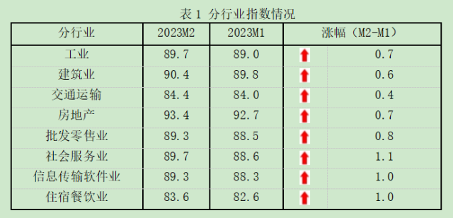 2月份,隨著經(jīng)濟(jì)逐步恢復(fù),8個行業(yè)指數(shù)均連續(xù)兩個月上升。服務(wù)業(yè)指數(shù)恢復(fù)速度領(lǐng)先,其中,社會服務(wù)業(yè)、信息傳輸計算機(jī)服務(wù)軟件業(yè)、住宿餐飲業(yè)和批發(fā)零售業(yè)指數(shù)分別上升1.1、1.0、1.0和0.8點。