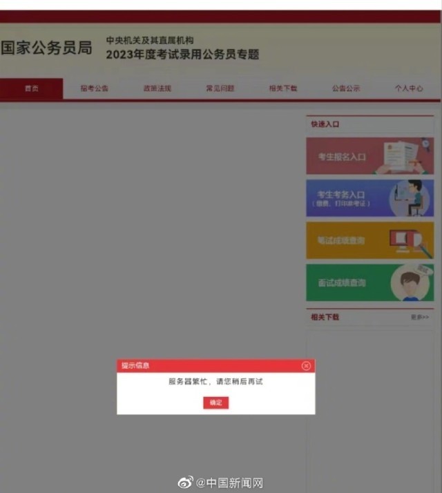 另據(jù)中新網(wǎng)報(bào)道,14日晚間,不少考生在網(wǎng)站曬出剛剛查到的2023國(guó)考筆試成績(jī)。一些網(wǎng)友反映2023國(guó)考專題網(wǎng)頁上分?jǐn)?shù)查詢通道擁擠,網(wǎng)頁顯示“服務(wù)器繁忙”。